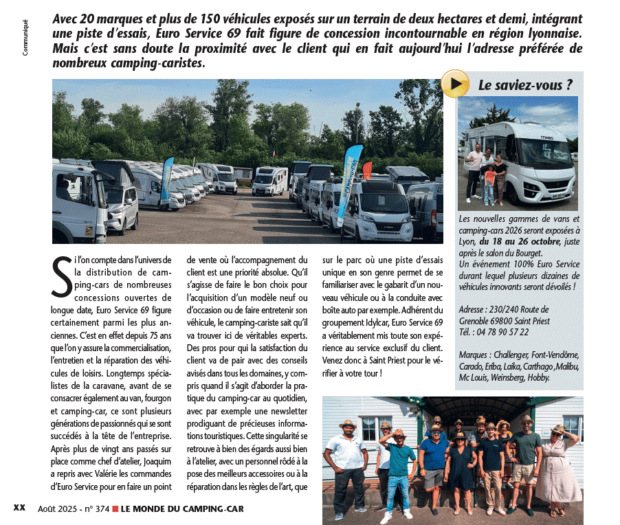 par Valérie et Joaquim Dos Santos, Euro Service, le spécialiste en camping-cars et caravanes, basé à Saint-Priest, fait désormais peau neuve. Fondée il y a 73 ans par monsieur Chanteur, l’entreprise familiale précurseur dans le domaine de la caravane sur l’est de la France et ayant développé le camping-car, a sans conteste, au fil des générations, su préserver son ADN. Exigeante sur la qualité de ses véhicules et de ses services, elle l’est aussi pleinement sur l’accompagnement de ses clients.