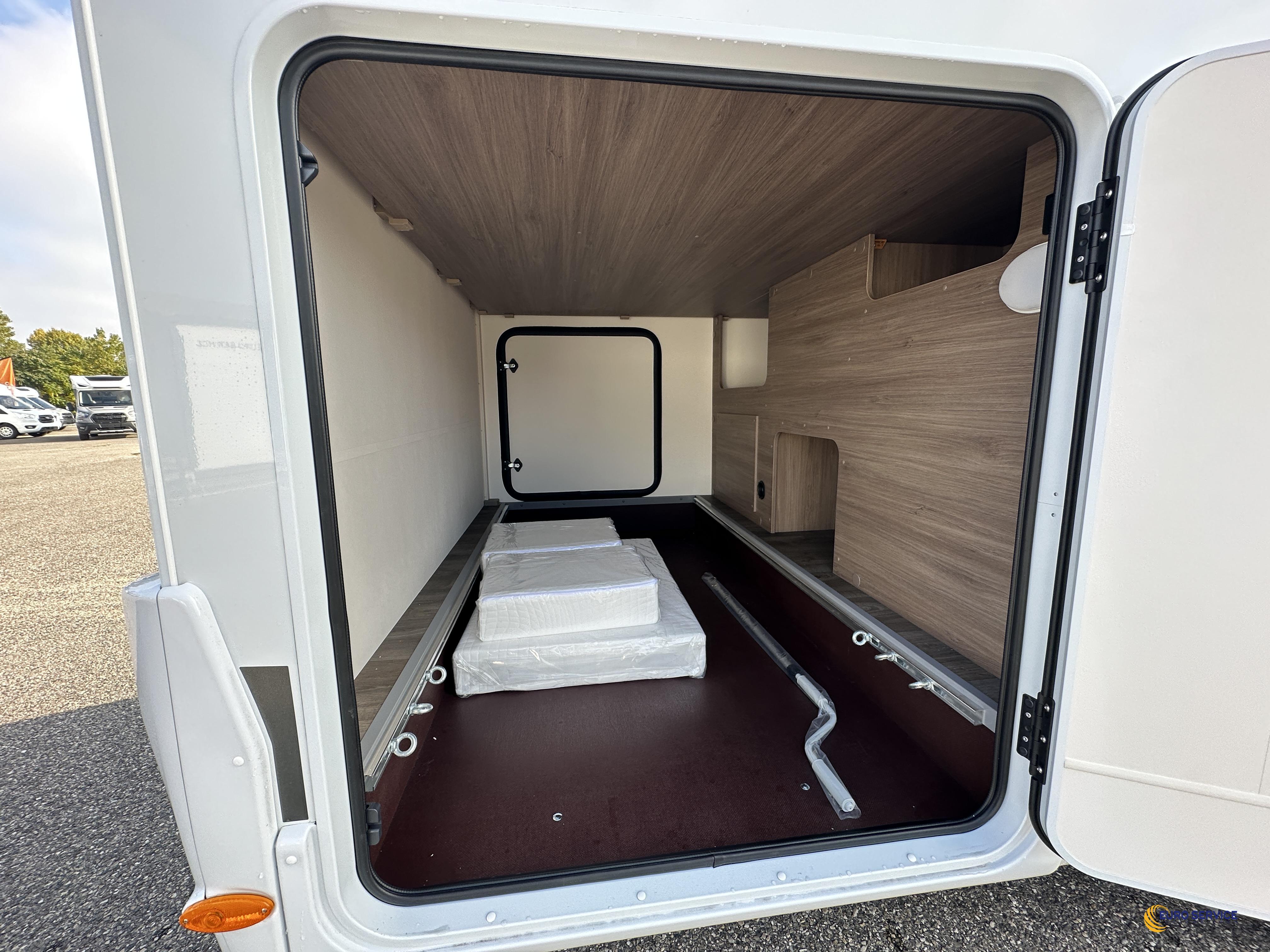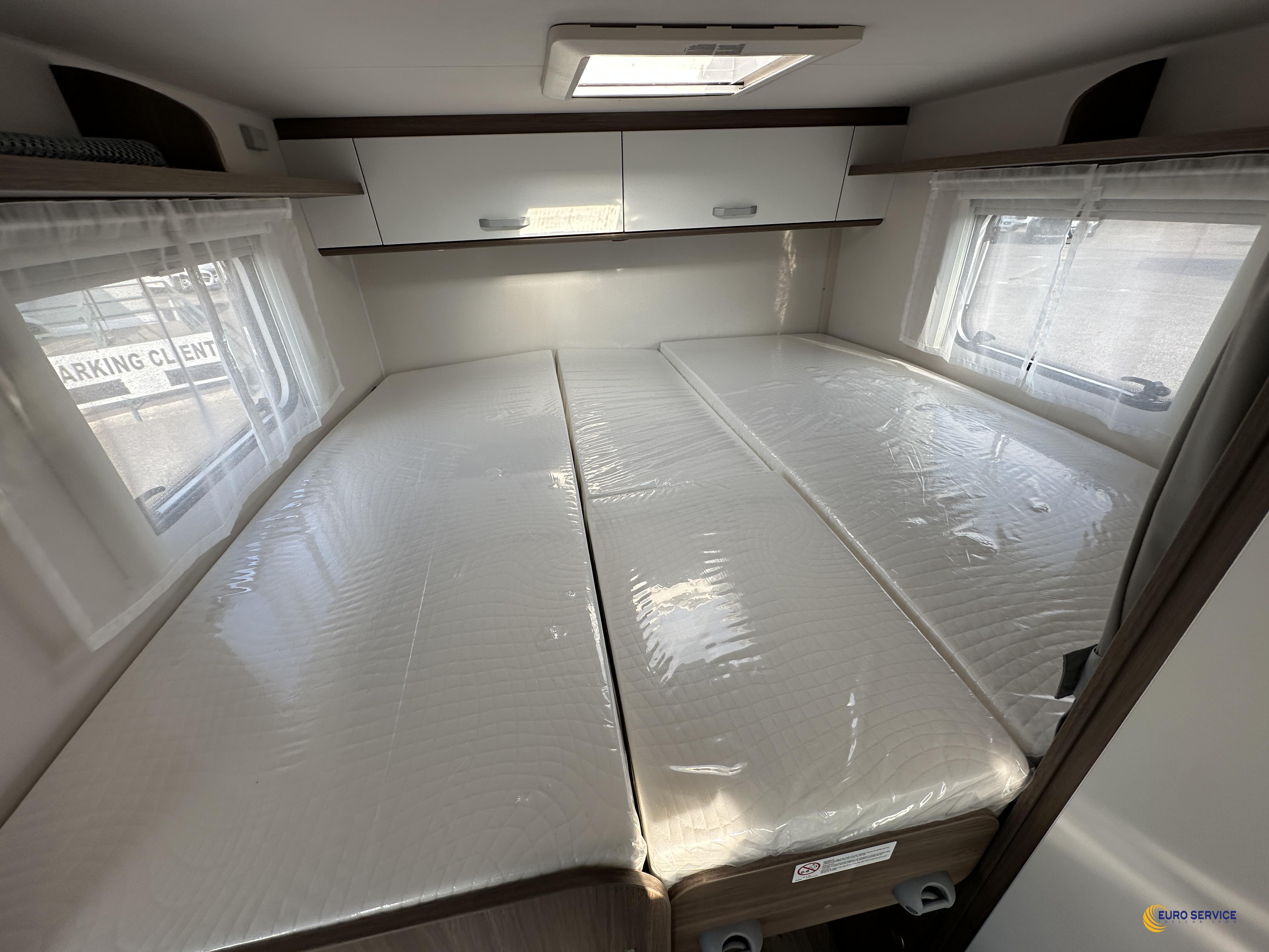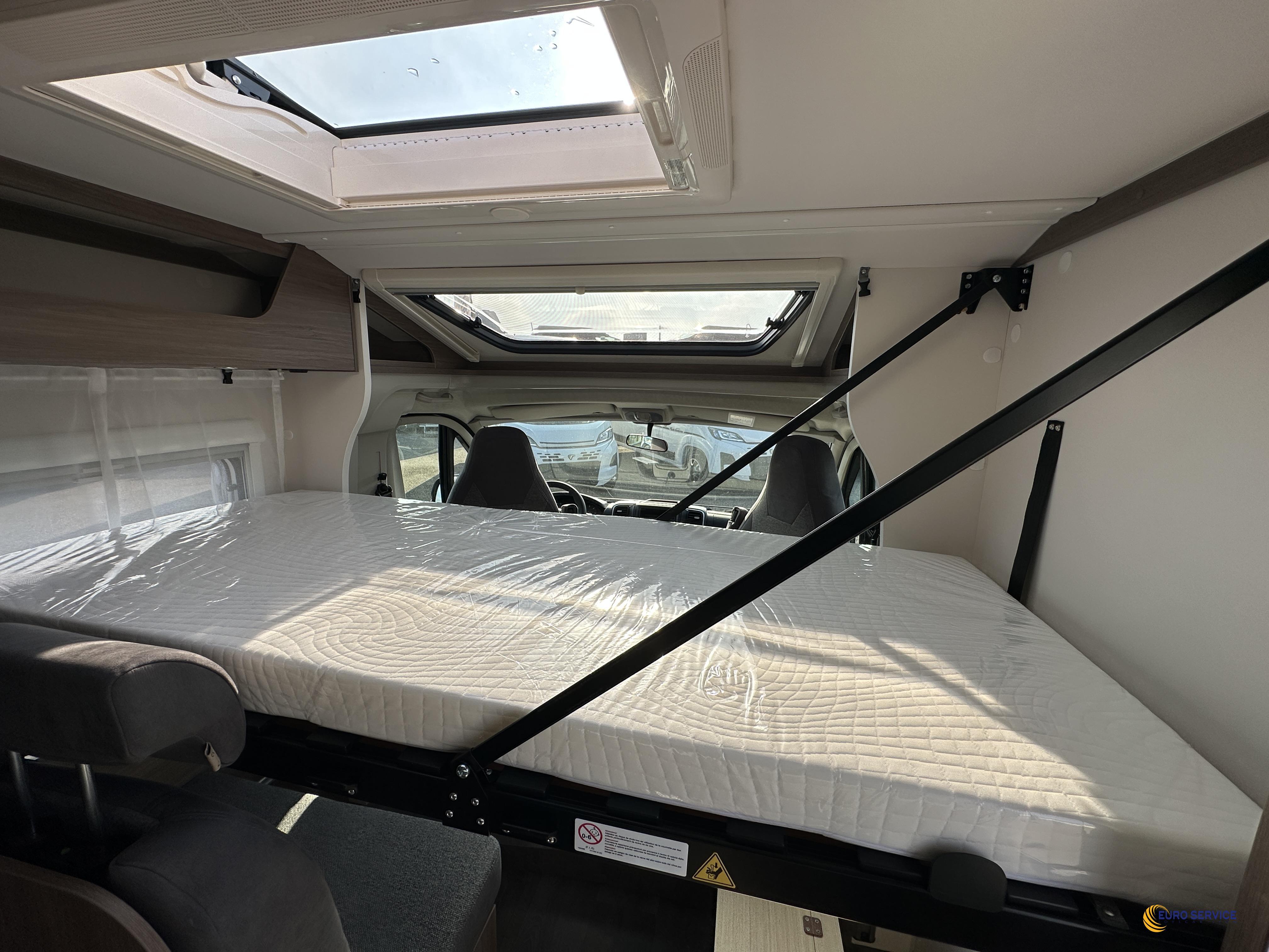 Moteur 140 ch, Couleur extérieure gris Artense métallisé, Pack Optique, Toit panoramique de cabine, 2ème trappe de soute, Réservoir eaux usées isolé, Store extérieur 4,0 m coloris blanc, Stores plissés de cabine, Coloris spécifique des portes des meubles de pavillon, Jantes alliage, Pack Confort.