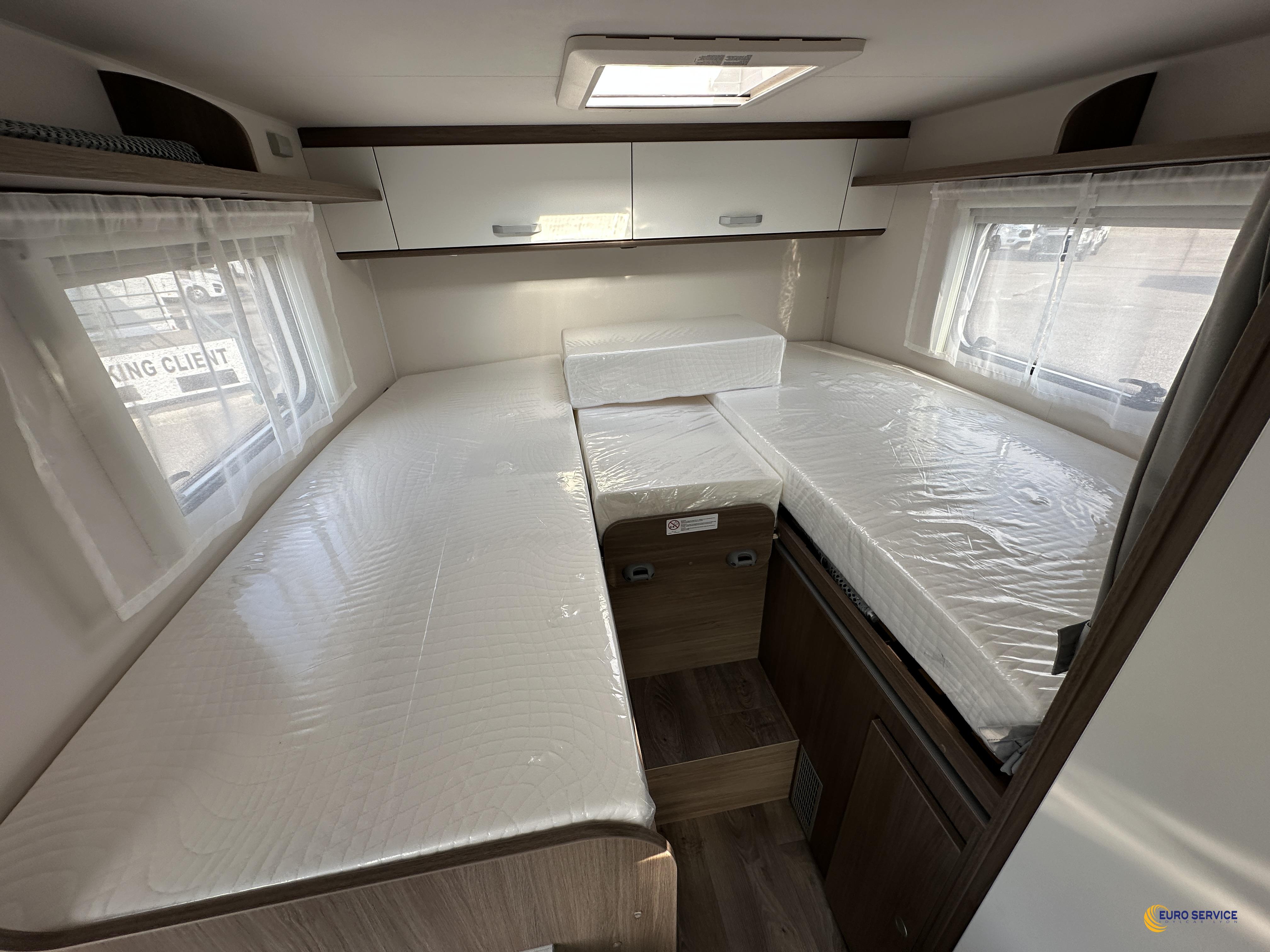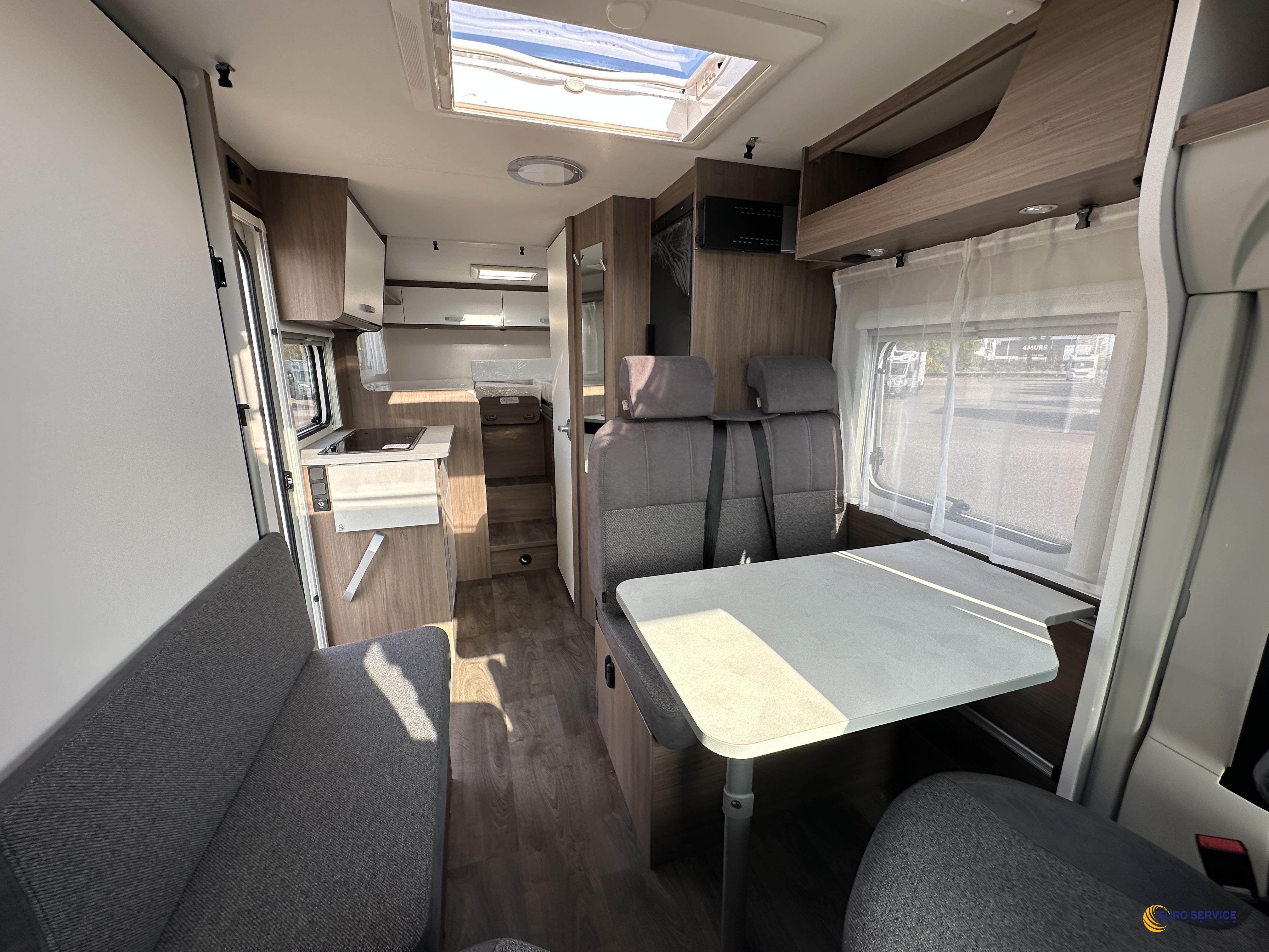 Moteur 140 ch, Couleur extérieure gris Artense métallisé, Pack Optique, Toit panoramique de cabine, 2ème trappe de soute, Réservoir eaux usées isolé, Store extérieur 4,0 m coloris blanc, Stores plissés de cabine, Coloris spécifique des portes des meubles de pavillon, Jantes alliage, Pack Confort.